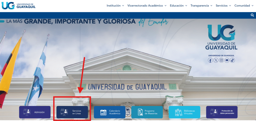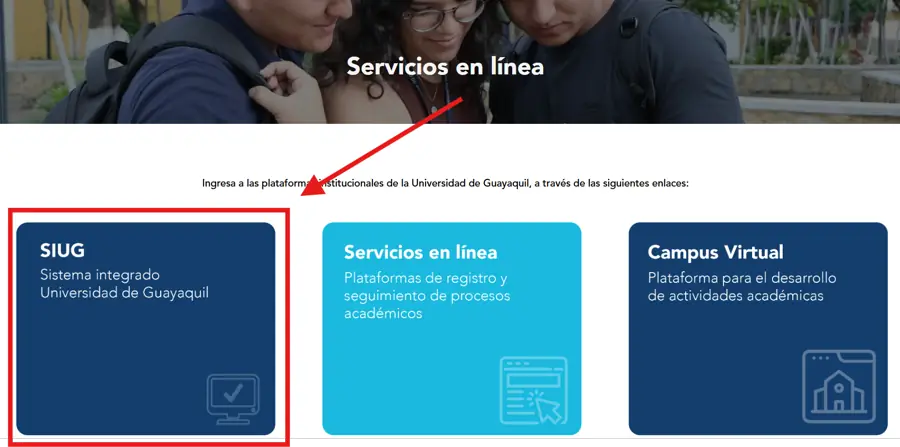 Desplázate hacia abajo en la página principal hasta encontrar la sección "Sistema Integrado de la Universidad de Guayaquil (SIUG)" en el apartado de Servicios en Línea. Es importante que no confundas esto con otros enlaces; en 2025, la universidad ha reorganizado su sitio web y muchos estudiantes cometen el error de buscar en el lugar equivocado.