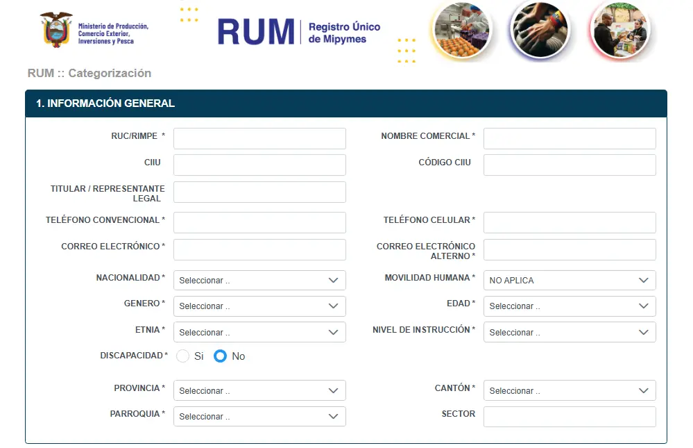 - Ingresa al portal oficial: Ve directamente a https://servicios.produccion.gob.ec/rum/ (no uses enlaces de terceros)