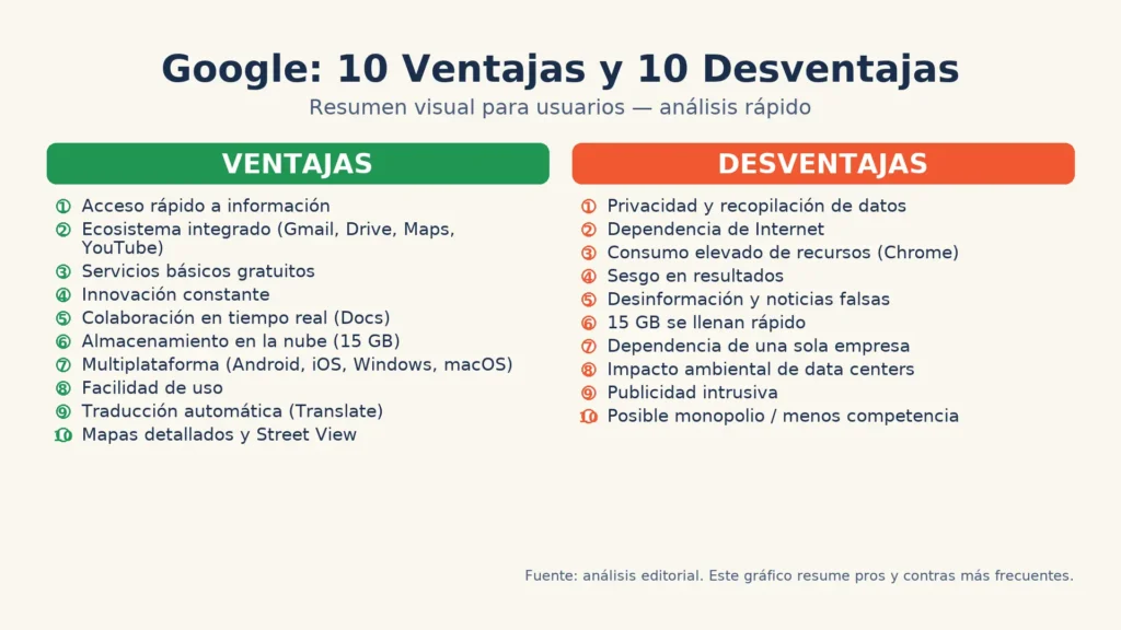 Tabla Resumen: 10 Ventajas y 10 Desventajas de Google